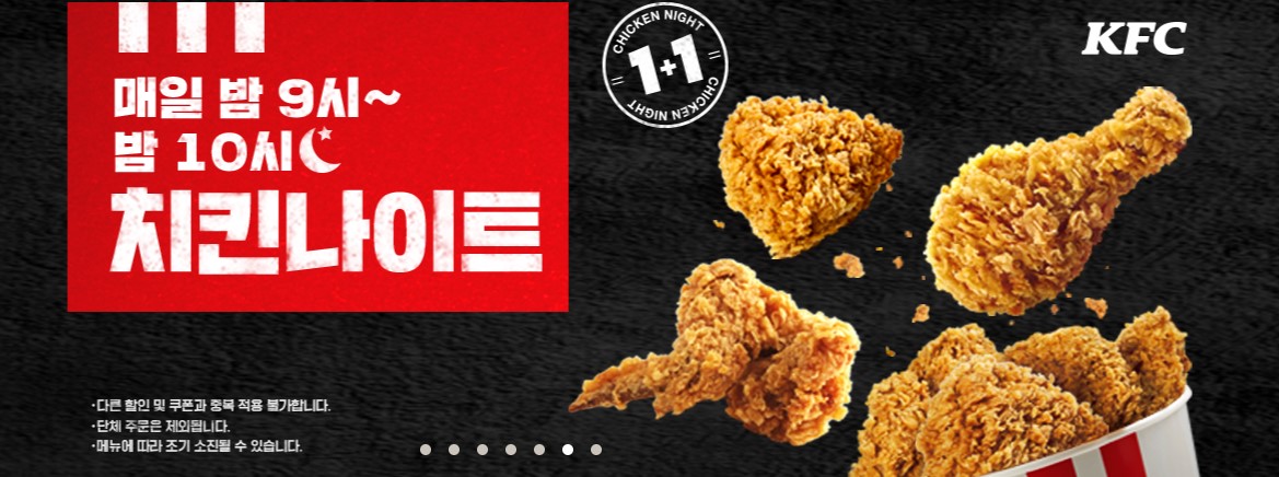 한국 KFC의 밤 9시~10시 1+1 행사는 알뜰족에게 딱! 저녁을 가볍게 먹고, 야식으로 치킨을 즐기는 것도 좋은 방법이에요.